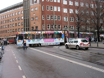 De 3046 op lijn 10 onderweg naar het Statenkwartier ontspoort in de Torenstraat ter hoogte van de Grote Kerk met het 1e en 2e draaistel. De tram staat met de eerste bak over dwars [...]
