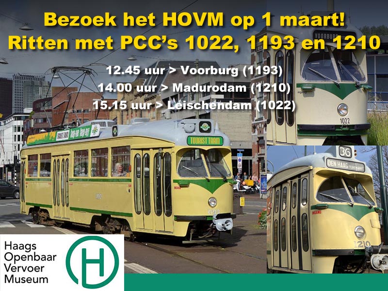Zondagmiddag 1 maart is er een extra reden om naar het HOVM te komen! Er zijn deze keer ritten met niet minder dan drie verschillende PCC’s: de 1022, de 1193 en de 1210! Koop een kaartje, kom tussen 12.30 en 17.00 uur naar het HOVM en kies uw rit!