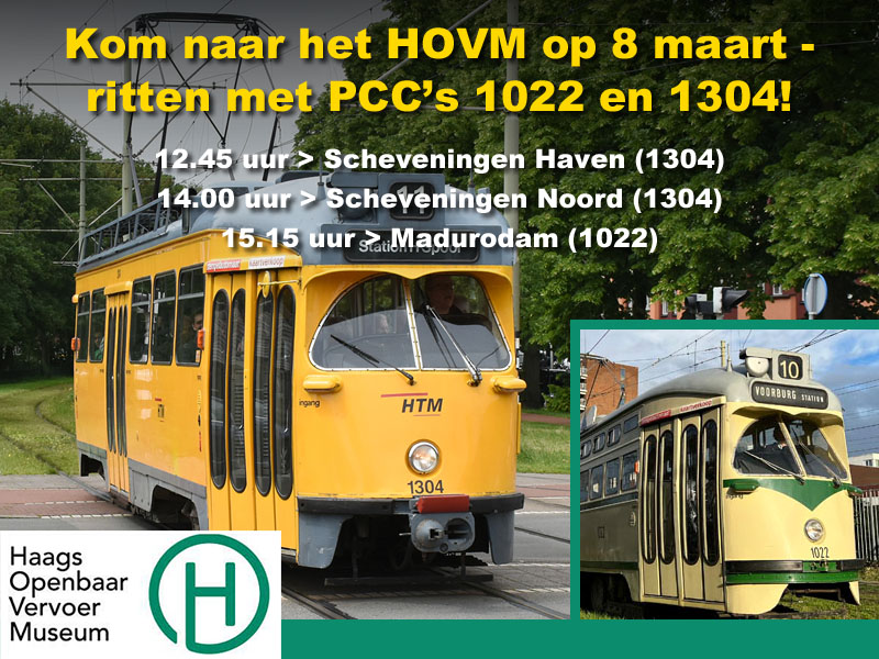 Het wordt een prachtig zonnig weekend, dus alle reden voor een rit met een museumtram van het HOVM! Het museum is zondagmiddag 8 maart geopend van 12.30 tot 17.00 uur en er zijn ritten met de gele 1304 en crème-groene 1022.