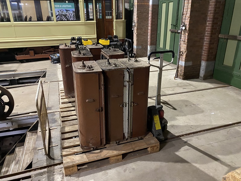 Over schakelkasten gesproken. Een aantal reserve exemplaren ligt opgeslagen in een put onder de trams. Om ruimte te maken moesten deze naar een andere put verhuizen. Met een kraan worden de zeven kasten in en uit de putten gehesen.