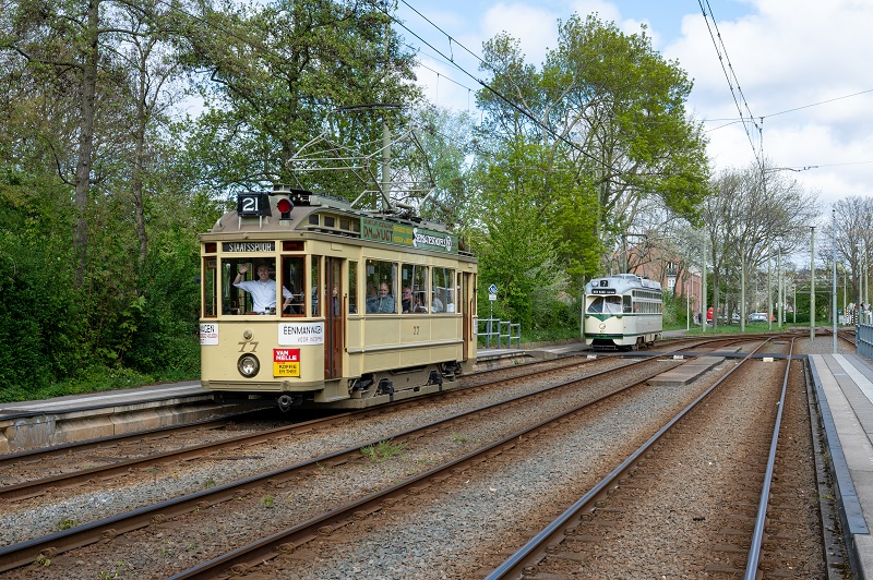 Naast alle werkzaamheden aan onze trams zijn er ook nog de zondagse ritten. Zo rijden Ombouwer 77 en PCC 1022 naar het eindpunt van lijn 2 in Kraayenstein.
