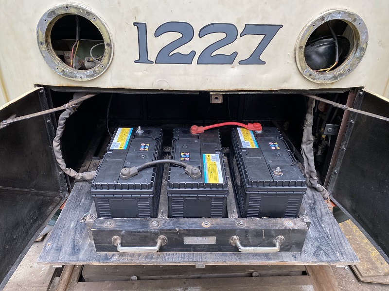 Bij PCC 1227 zijn na het schoonvegen van de accubak de nieuwe accu’s geplaatst en hebben we de sluitplaten van de koningspennen schoongemaakt en in de primer gezet. Volgende stap is de loodzware motorgenerator in de tram hangen.