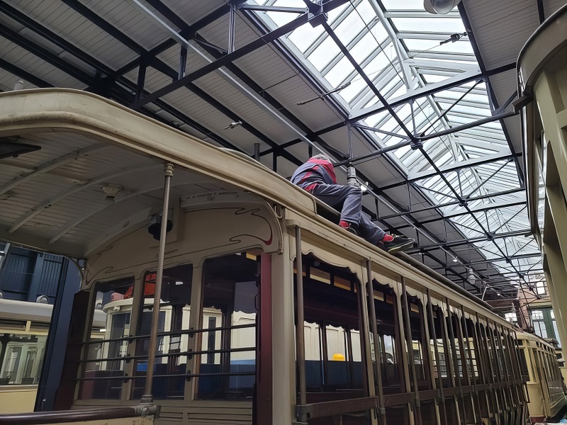 Het dak van open tram 505 kan ook wel een schilderbeurt gebruiken. We zijn nu eerst de deels loszittende verf aan het verwijderen en dat is nog een heel karwei.