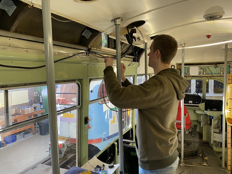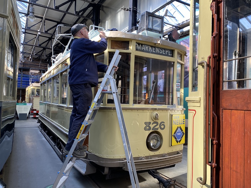 Naast de opening op zondag gaat het werk aan onze museumtrams ook gewoon door. Het schilderen van het dak van de 826 bijvoorbeeld na een lekkage in deze wagen. Het verwijderen van de barkrukken uit de Partytram om nieuwe vloerbedekking aan te kunnen leggen, het schrapen van de verfresten van het dak van open tram 505 om hem opnieuw te kunnen schilderen en het inbouwen van ledverlichting en de bijbehorende bekabeling in Tourist Tram 1101.