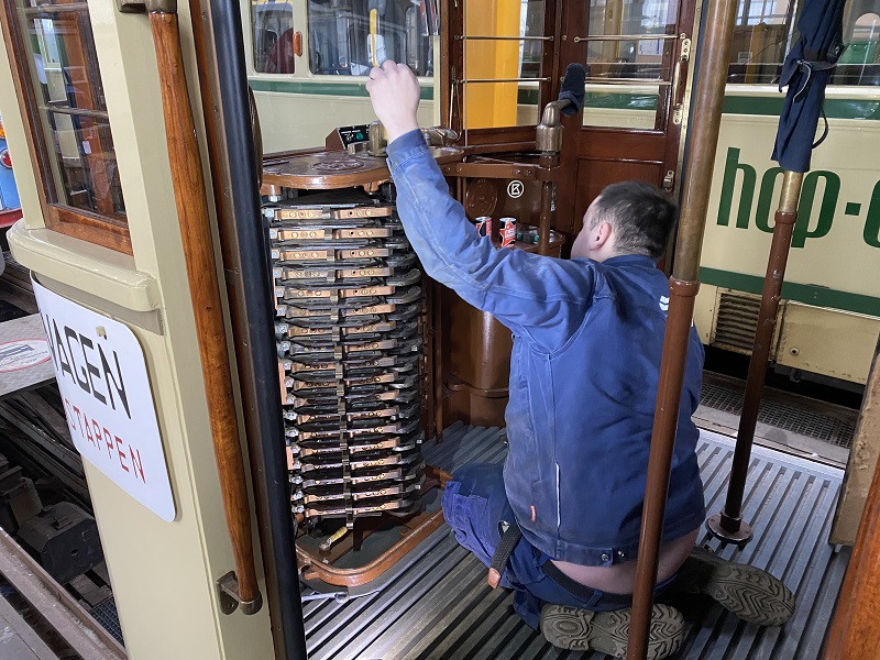 Bij de restauratie van PCC 1227 maakt het team grote vorderingen. Zo zitten de zandstrooiers weer onder wagen en ze werken. Na mislukte pogingen is het nu wel gelukt om een tweepersoonsbank op de vloer te bevestigen. We maken nu gebruik van messing pluggen die in de vloer gaan en zo kunnen de bouten met een ring erin gedraaid worden. De bank staat en zit als een huis. Ook heeft de accelerator drie nieuwe contacten gekregen. Ze worden allemaal vervangen. En de 1227 heeft een echte “1200” rijkruk. De kruk die er in zat gaat naar de 1006 en dus naar de Verenigde Staten waar de tram zijn rondjes gaat draaien in een museum in Washington, naast de 1329.