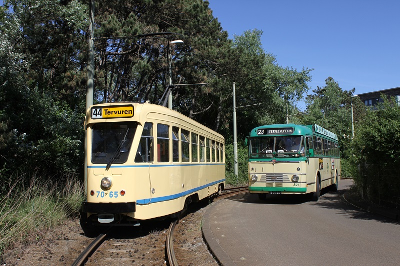 De Brusselse PCC 7065 steelt opnieuw de show. We organiseren op veler verzoek extra publieksritten en leden van de NVBS toeren een middag over lijn 12 met de Belgische tram en als extra gast Kromhout 327 van het Haags Bus Museum. Het is ook een bedankje aan de NVBS die financieel heeft bijgedragen aan het organiseren van PCC 75.