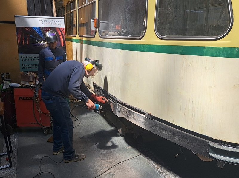 De wagenbak van PCC 1227 krijgt op enkele slechte plekken nieuw plaatwerk. Deze klus wordt uitgevoerd door Nina en Willem, een oud werknemer van HTM die actief is geweest in de plaatwerkerij aan de Lijsterbesstraat.