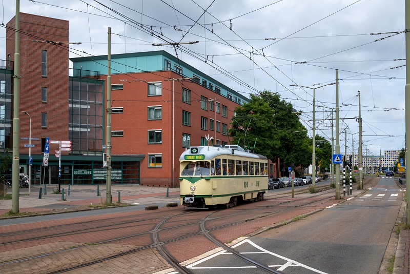 Vanwege de plaatsing van een grote kraan op de Schedeldoekshaven is daar tijdelijk geen tramverkeer mogelijk. De bovenleiding is zelfs weggehaald. De Touristtram rijdt daarom een omleidingsroute van het centrum naar het Centraal station. Zo zien we PCC 1101 ook eens op de Laakkade.