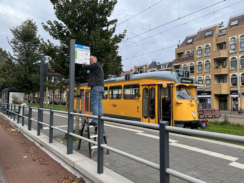 De Tourist Tram kan tegenwoordig weer een uitgebreider rondje via het Statenkwartier rijden en om dat aan de reizigers te laten weten plakken we stickers op de halteborden waar deze nog niet hingen. Met ladder en al gaat het PCC 1304 in en doen we de betrokken haltes aan.