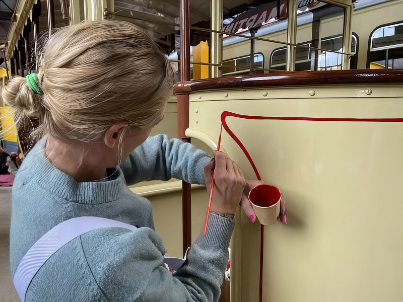 Blauwe tram A327 krijgt bladgoud op de wagennummers en bedrijfsemblemen, de oude waren wat vaal geworden.