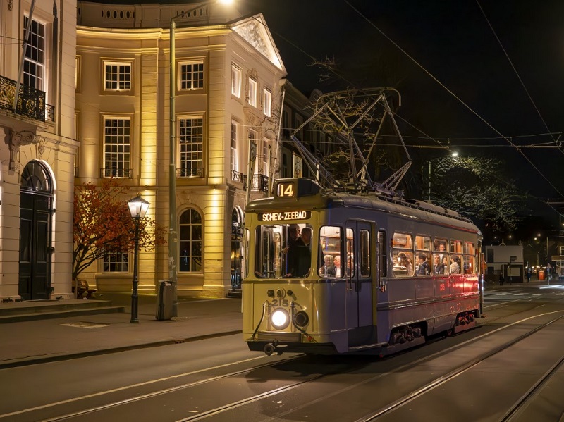 Een ander hoogtepunt is de eerste rit met passagiers van de prachtig gereviseerde 215. Door een sfeervol verlicht Den Haag maakt de Zwitser een trouwrit na goedgekeurd te zijn door HTM.
