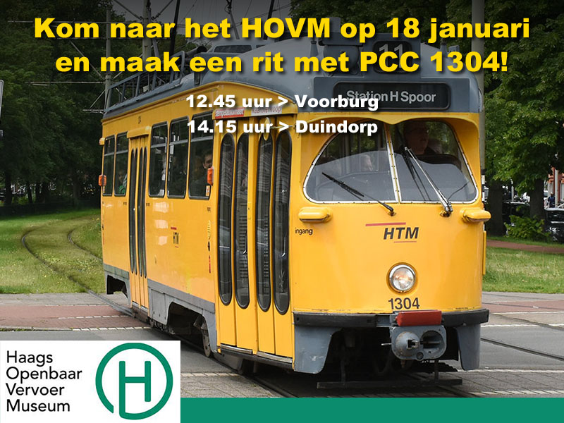 Kom naar het HOVM op zondag 18 januari en maak een rit met een historische tram! Het leukste museum van Den Haag is geopend van 12.30 tot 16.00 uur (iets korter dan normaal!) en er zijn ritten met de “jaren zeventig-PCC” 1304.
