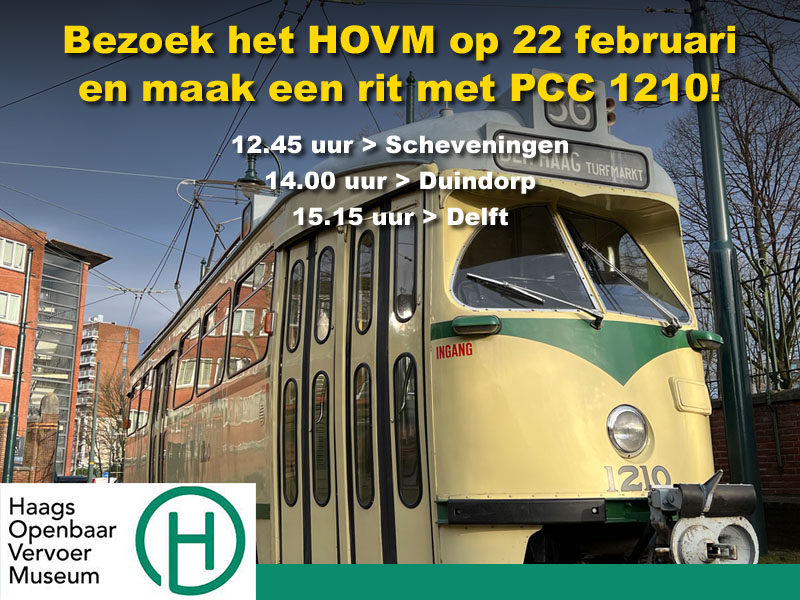 Bezoek HOVM op zondagmiddag 22 februari en maak een rit met de mooie crème-groene “jaren zestig PCC” 1210! Het HOVM is deze zondag geopend van 12.30 tot 17.00 uur en u kunt kiezen uit drie tramritten.