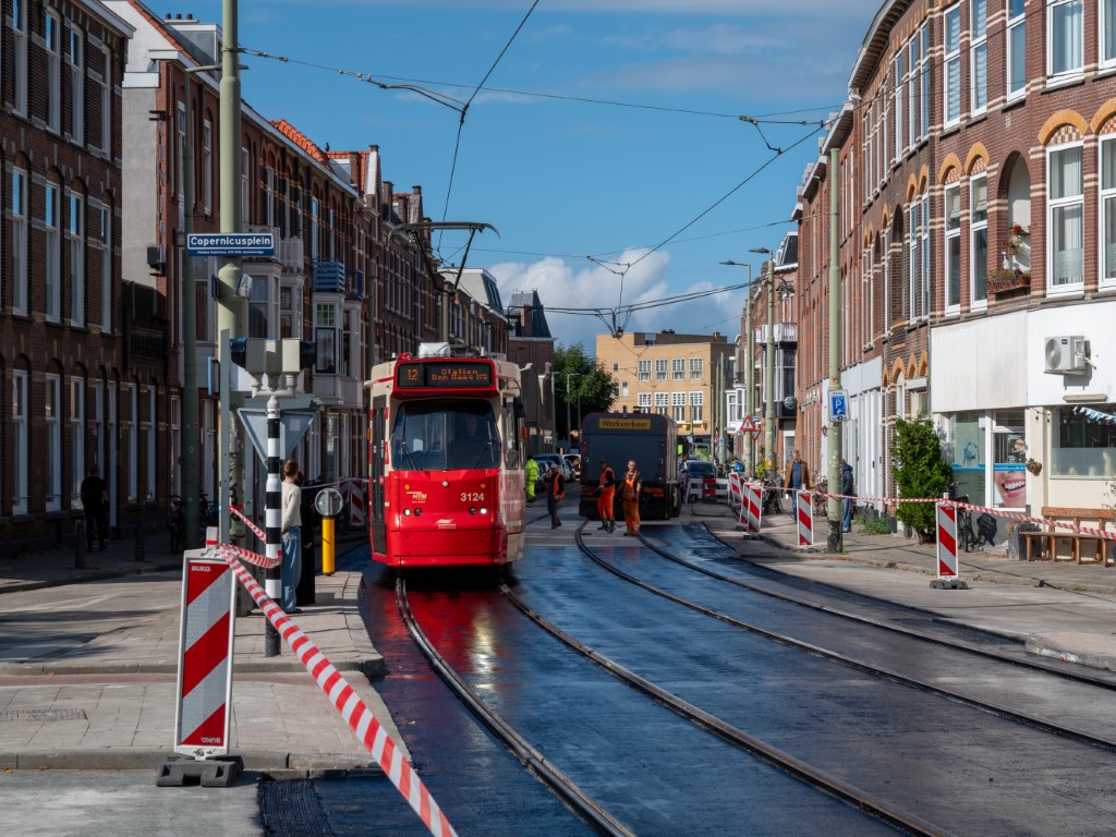 Door deze tegenvaller wordt de planning niet gehaald. Oorspronkelijk zou de tramdienst op 21 september hersteld moeten zijn maar dat wordt nu een week later. Een dag na de herstart van lijn 12 in de Edisonstraat zien we dat de bitumenlaag op de betonnen toplaag wordt gespoten. Wat dan nog rest is een laag asfalt en zijn het Copernicusplein en de Edisonstraat weer even af van werkzaamheden.