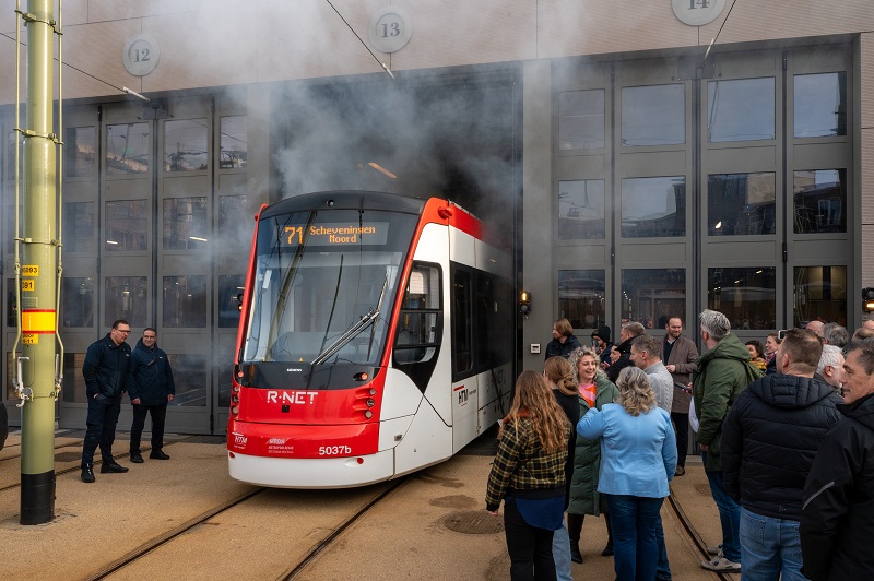 Openingstram is donderdag Avenio 5037 die met (oud-) trambestuurders van de remise Scheveningen de stallingsruimte binnen rijdt. Er zijn opvallend veel oud HTM’ers aanwezig wat volgens operationeel directeur Karen Bosch een bewijs is voor het familiegevoel en de betrokkenheid van het Scheveningse personeel. Tijdens de opening onthullen Rien Heilbron, directeur Techniek HTM en Simon Fortuyn, regiobestuurder van de Metropoolregio een kunstwerk aan de gevel. Het tegeltableau is gemaakt door de Haagse kunstenaar Guido Pera en verbindt op een mooie manier verleden, heden en toekomst.