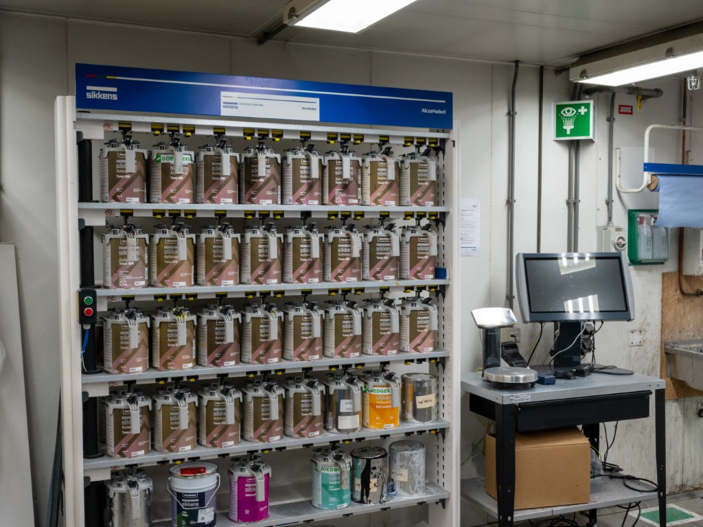 Hier worden de verfkleuren in juiste verhouding gemengd.