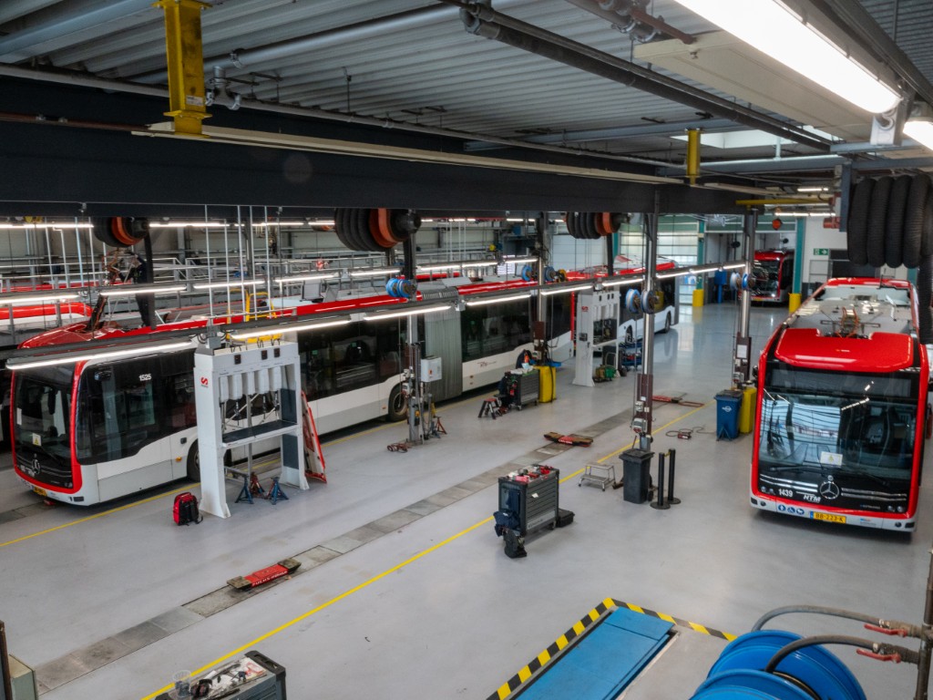 In de werkplaats zijn verschillende stands geplaatst waar voorop plek is voor de achttien meter lange eCitaro G bussen en op het achterste deel past er nog een twaalf meter bus achter. Zo kunnen tien bussen tegelijkertijd gerepareerd worden of van onderhoud genieten.