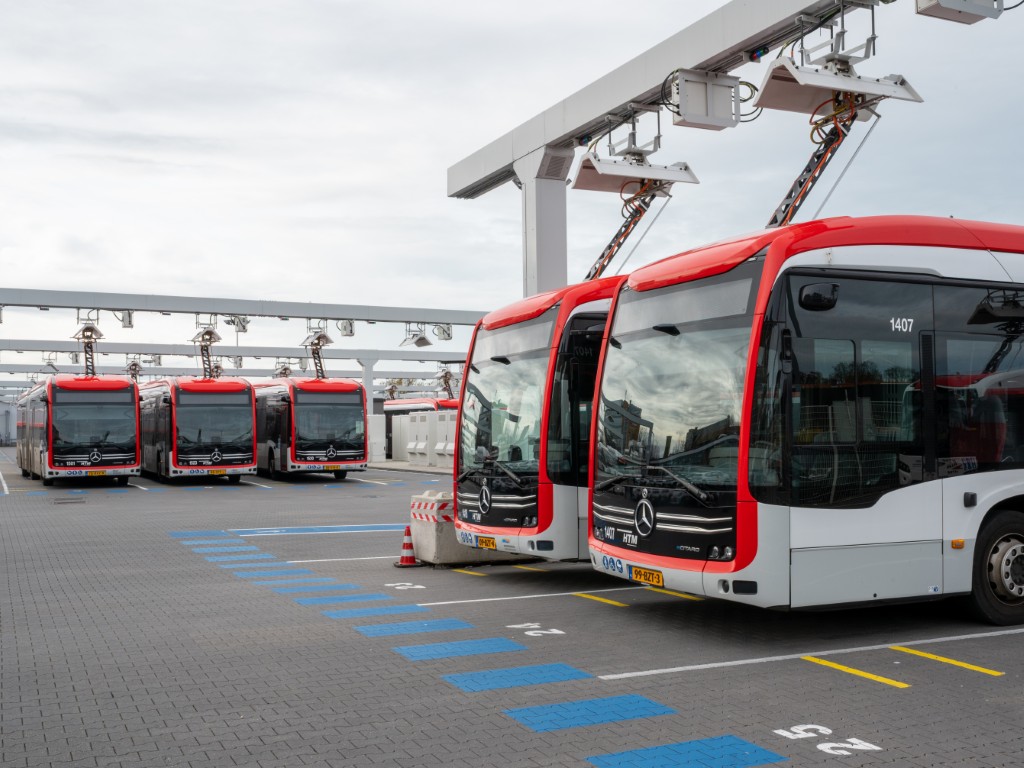 Bussen aan de lader op het verbouwde terrein van HTM.