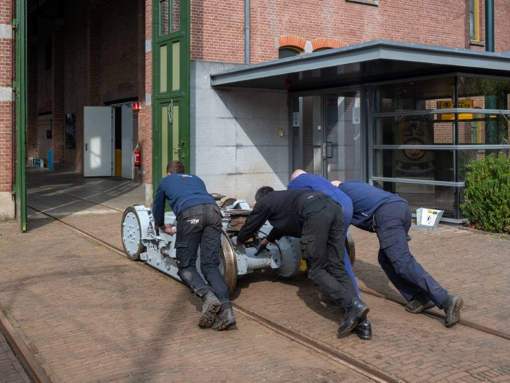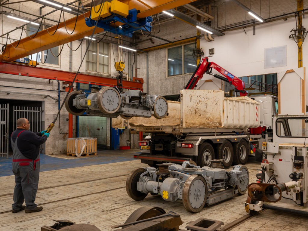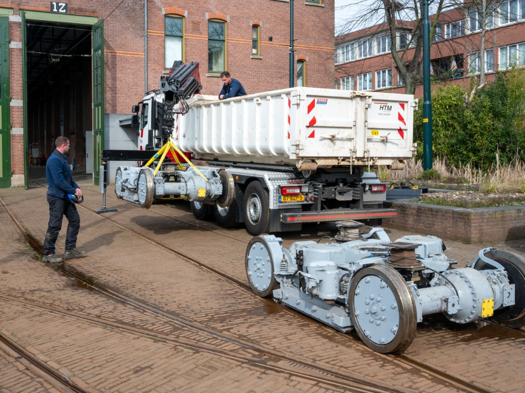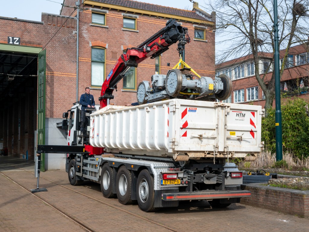 In de ochtend staan de twee ‘nieuwe’ draaistellen te wachten op transport. HTM stuurt een grote kiepauto waarvan we hopen dat de kostbare draaistellen gaan passen. Met de kraan van de werkplaats worden de draaistellen redelijk eenvoudig in de laadbak geplaatst. Per stuk wegen ze 4 ton!
