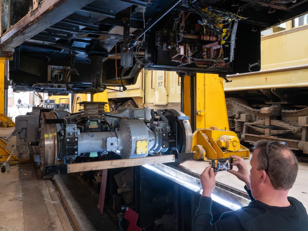 Terwijl de draaistellen onder de PCC rollen kunnen we ook mooi zien hoe ver men inmiddels al is gevorderd met de restauratie van de onderzijde. De tram is op dat vlak bijna klaar. Maar er is nog een hoop te doen!
