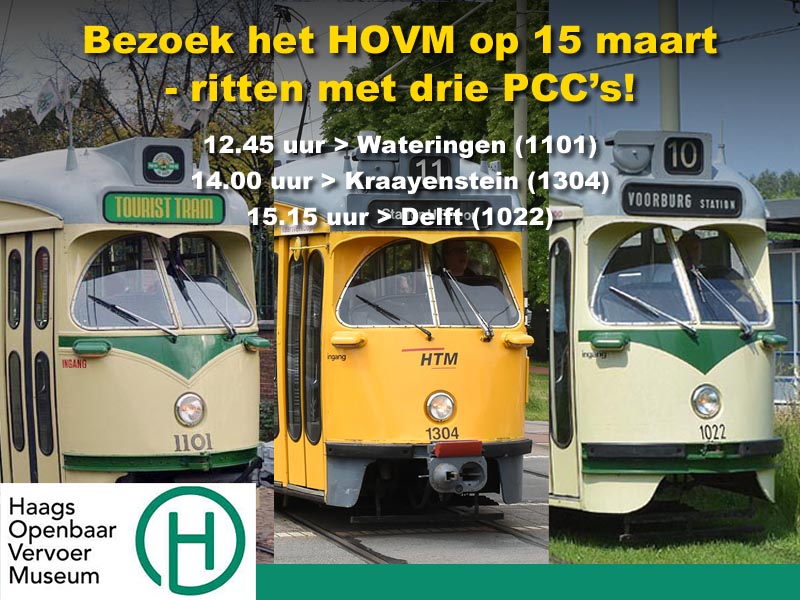 Kom op zondagmiddag 15 maart naar het HOVM en maak een rit met een van de drie PCC’s die dan worden ingezet. Het leukste museum van Den Haag is geopend van 12.30 tot 17.00 uur en er zijn ritten met de PCC’s 1101, 1304 en 1022.
